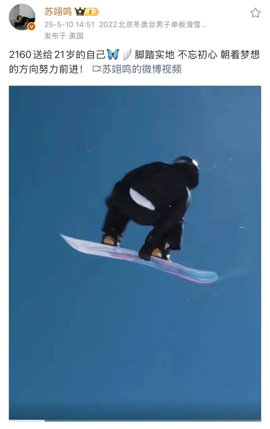 4年前,北京冬奥会男子单板滑雪大跳台决赛,苏翊鸣仅两轮便锁定冠军。最后一跳,他只是一个猛子冲入天空,翻了个跟头,尽享他的“荣誉之跳”。