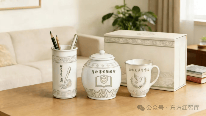 邢白瓷三器(杯、筒、罐):以千年邢窑技艺为载体,镌刻国防动员标语与图案,寓“润物无声守家国、执笔立志卫山河、厚积薄发强国防”之思,让瓷韵与国防情怀共生。